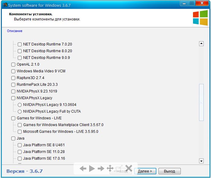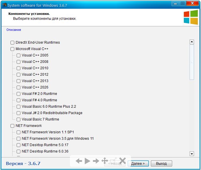 Не имеете достаточного опыта в настройке операционных систем и удивляетесь, что абсолютно новая ОС работает с ошибками? Вам в помощь набор программных продуктов System Software for Windows от Cuta. Этот автор специализируется на создании облегченных редакций Винды и начинал еще со времен XP, поэтому прекрасно знает, что именно требуется для стабильной работы старых и современных редакций от Microsoft. Это достаточно компактный образ, в который включено самое необходимое. Здесь вы не найдете мощных тяжелых прог, как в весящих за 30 Гб WPI от Beloff – исключительно системные библиотеки, плагины и прочие сопутствующие компоненты для нормальной работы ОС. Сборка оптимизирована под максимальную производительность и минимальное потребление ресурсов компьютера, что особенно актуально для слабых машин. Скачать System software for Windows торрент могут как опытные пользователи, так и новички. Главным плюсом сборника является полная автоматизация процесса установки. Вам нужно запустить исполняемый файл Installer.exe, после чего откроется мастер-помощник. Интерфейс интуитивно понятен даже для тех, кто впервые имеет дело с настройкой системы. Есть несколько сценариев открытия перечня софта. Оптимальный подразумевает отметку наиболее подходящих пунктов без вашего участия. Если никогда не занимались переустановкой Винды – данный вариант для вас. Программа сама определит, что нужно именно вашей системе, учитывая все особенности конфигурации. Более продвинутым юзерам рекомендуется использовать опции Выбрать все или Без выбора. В первом случае все чекбоксы будут отмечены и вам останется снять галочки с лишнего, а во втором – выбор делается с нуля. Такой подход дает полный контроль над процессом и позволяет установить только действительно необходимые компоненты. Тип ОС, разрядность и совместимость с определенными компонентами тоже определяется без вашего участия. Вы просто не сможете установить неподходящее ПО, так как строки будут неактивными. Например, нельзя поставить предназначенные для Windows 11 Visual C++ 2026 на XP или Семерку. Система автоматически блокирует несовместимые варианты, исключая ошибки установки.