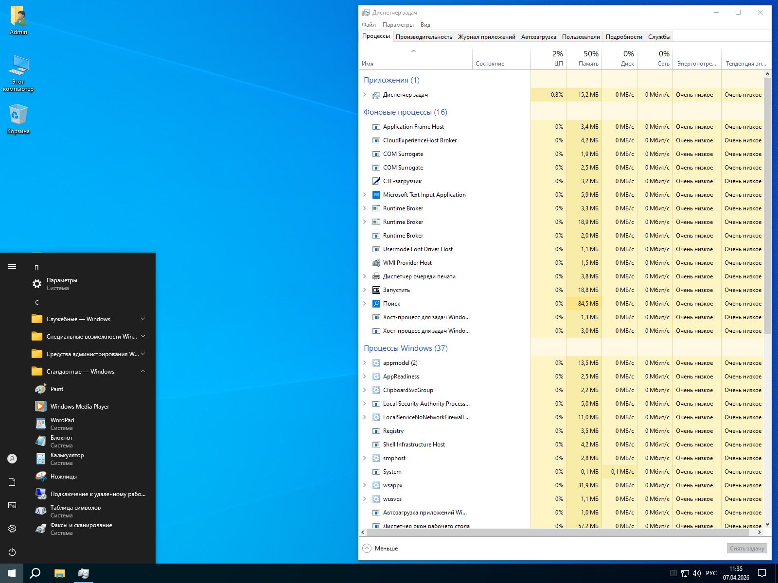 • Фоновые службы — P2P-обновления, автообновление карт, помощник по совместимости, индексирование (переведено на минимум) и множество задач планировщика — всё деактивировано.