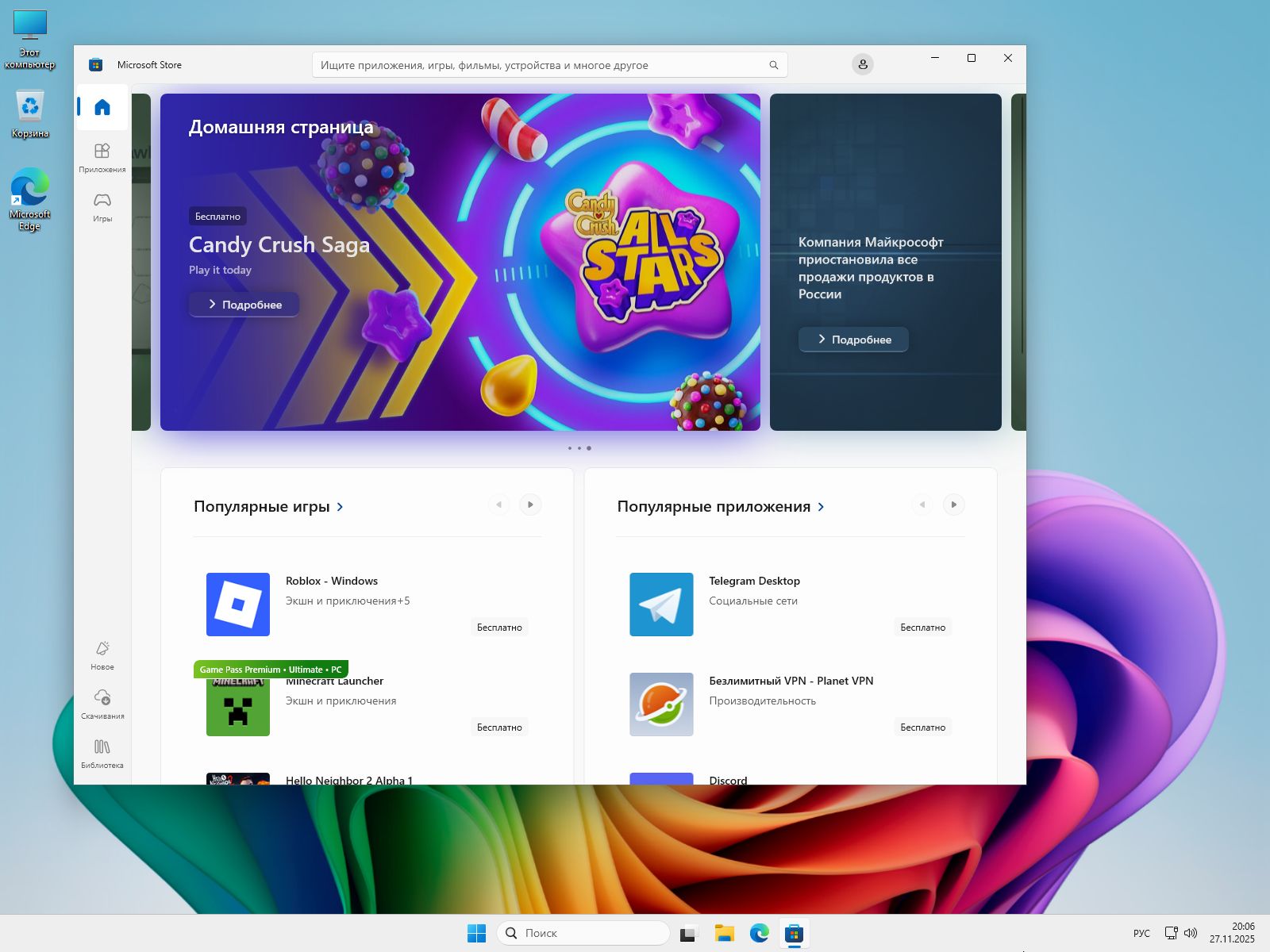 Представляем максимально настроенную сборку Windows 11 Профессиональную x64 25H2 для ноутбука. Сборка отличается повышенной производительностью и компактностью. Также отметим, что редакция может устанавливаться на слабое железо, не поддерживающееся оригинальными версиями. Внесены значительные изменения в интерфейс – значки располагаются максимально близко друг к другу, за счет чего занимают меньше места на рабочем столе. Пользователи смогут более эффективно организовать рабочее пространство и найти нужные программы с первого взгляда. Для облегчения образа и системы в развернутом состоянии удалены и отключены многие бесполезные компоненты. Сборка Виндовс 11 идеально подходит для геймеров. В ОС отсутствует Защитник – встроенный антивирус, который блокирует патчи, активаторы и другие необходимые инструменты без цифровой подписи. Кроме того, он не способен определять большинство реальных угроз и серьезно нагружает аппаратные ресурсы компьютера, замораживая систему при проверках. Без него производительность заметно возрастает. Вместе с ним вырезан и другой элемент Центра безопасности – сетевой фильтр Smart Screen. Этот компонент не всегда правильно определяет наличие вредоносного кода на сайте, поэтому вы можете без проблем попасть на фишинговые-ресурсы, но в то же время доверенные сайты часто блокируются ошибочно. Скачать Windows 11 Pro x64 версия 25H2 - быстрая сборка для ноутбука на русском вы можете вместе с набором самых актуальных обновлений по Ноябрь 2025 года через торрент или прямой ссылкой ISO образ. Система позволяет исправить известные проблемы безопасности, а также вносят улучшения в оформление системы. Пуск стал адаптивным и гибким – в него помещается необходимое количество значков без переполнения. Реализована удобная группировка приложений по различным критериям, что облегчает навигацию. Автор интегрировал в ОС папку с несколькими портативными программами – она размещается в корне локального накопителя для быстрого доступа. Это экономит время на установку дополнительного софта и делает систему еще более автономной. Для установки понадобится скаченный iso образ Виндовс 11 25H2 64 бит, флешка от 8 Гб и бесплатная портативная утилита Руфус.