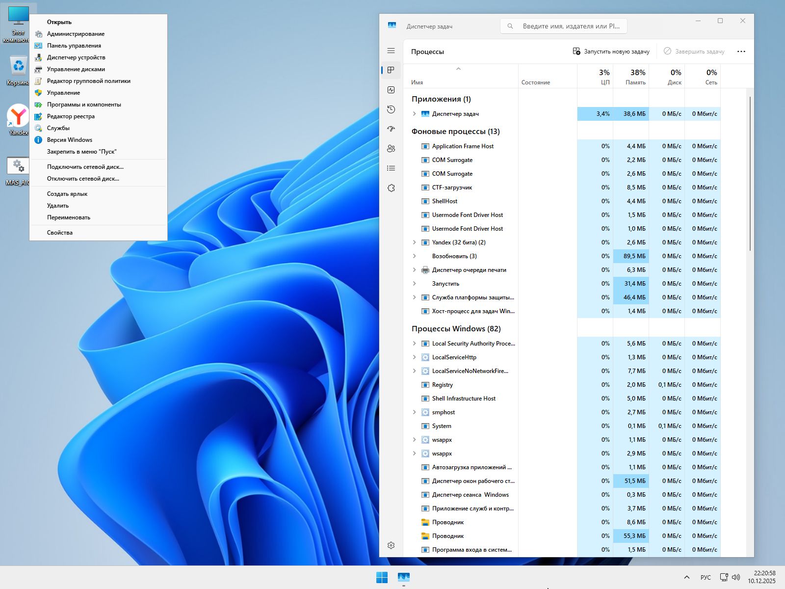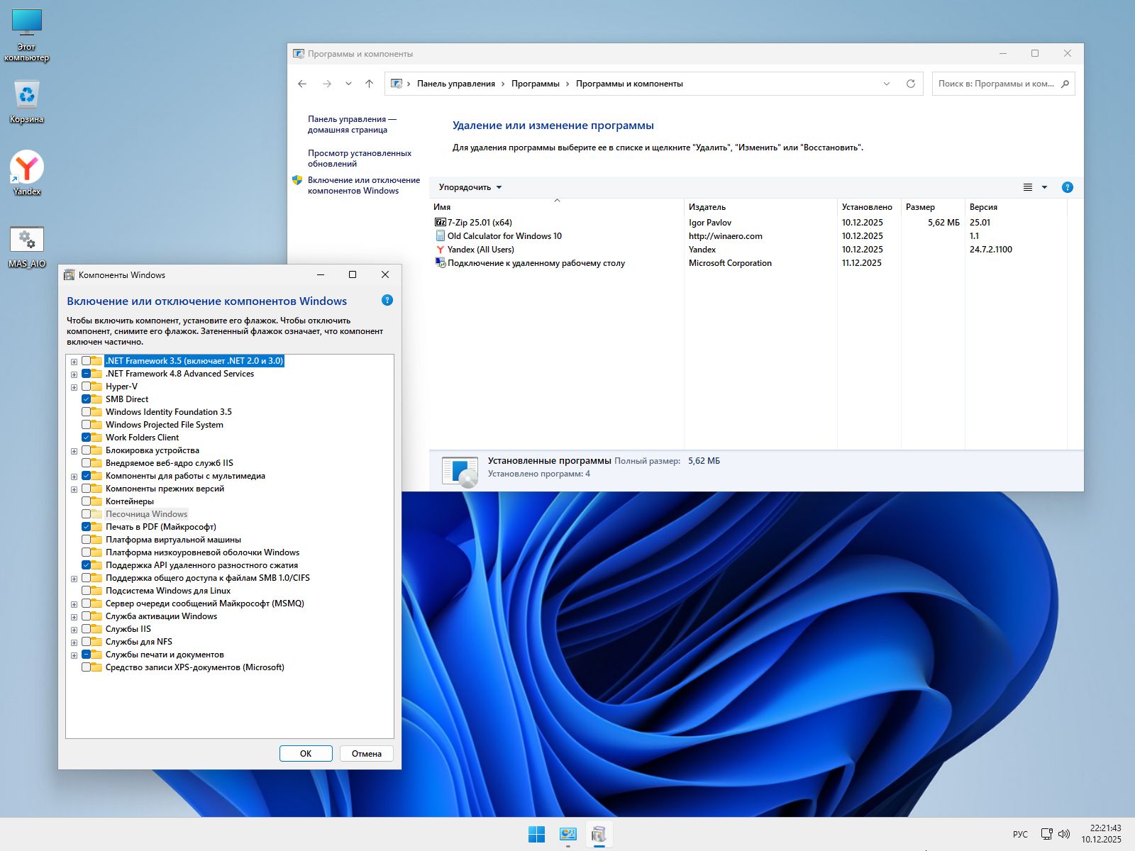 Обновленная легкая сборка Виндовс 11 25H2 Pro/Enterprise 64 бит от OneSmile на русском с активацией и драйверами. Автор в очередной раз предлагает 2 редакции – Профессиональную и Корпоративную в облегченных вариантах. Обе версии предоставляются без предустановленных приложений, так что занимают меньше места на локальном накопителе по сравнению с оригинальной Windows 11. Также отсутствует Защитник и прочие компоненты Центра безопасности. Отсутствует Кортана, так как она не нужна в принципе из-за того, что не понимает по-русски. При том, что в системах присутствует ИИ-ассистент, голосовая помощница является лишним элементом. Ускорена обработка игровой графики за счет повышения частоты кадров FPS. Благодаря этому геймеры могут запускать игры на самых высоких параметрах, которые позволяет компьютер. Специально настроенные параметры энергопотребления помогают выжать максимум производительности из видеокарты. Последний пакет апдейтов устраняет уязвимости безопасности, в число которых входит 3 уязвимости нулевого дня. Также поправлена проблема, связанная с вызовом ассистента через фразу Спросить Copilot, после которой не включалась опция Click to Do. Разработчики добавили исправления для стабильной работы с USB-устройствами – теперь флешки и внешние диски определяются быстрее. Скачать Windows 11 25H2 Lite Edition x64 Pro/Enterprise - для старых и новых ПК через торрент или прямой ссылкой, интересно тем, кому не нужны мусорные дополнения, мешающие работе с операционной системой. По умолчанию на рабочий стол выносится значок Этот компьютер, Корзина и ярлыки пользовательских папок. Автоматически устанавливаются 7-ZIP и WinRAR, которые позволят распаковывать архивы практически всех расширений. Оба архиватора уже активированы и готовы к использованию сразу после установки системы. В дальнейшем обновления будут устанавливаться в ручном режиме. Если не захотите, можете просто игнорировать выпуск новых апдейтов и не загружать их. Такой подход дает полный контроль над системой – никаких неожиданных перезагрузок не в подходящий момент. Также интегрирован Яндекс браузер, заменяющий Edge. В нем присутствуют собственные нейросети, предназначенные для работы с текстами, выдачей результатов поисковых запросов в различных форматах и т.п. Встроенная Алиса поможет найти нужную информацию голосом, а режим Турбо ускорит загрузку страниц при медленном интернете.