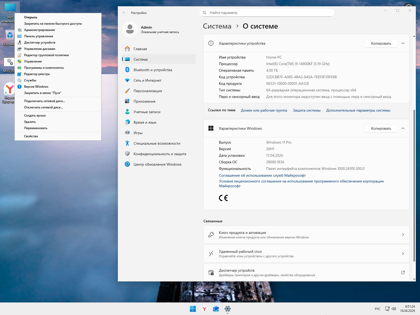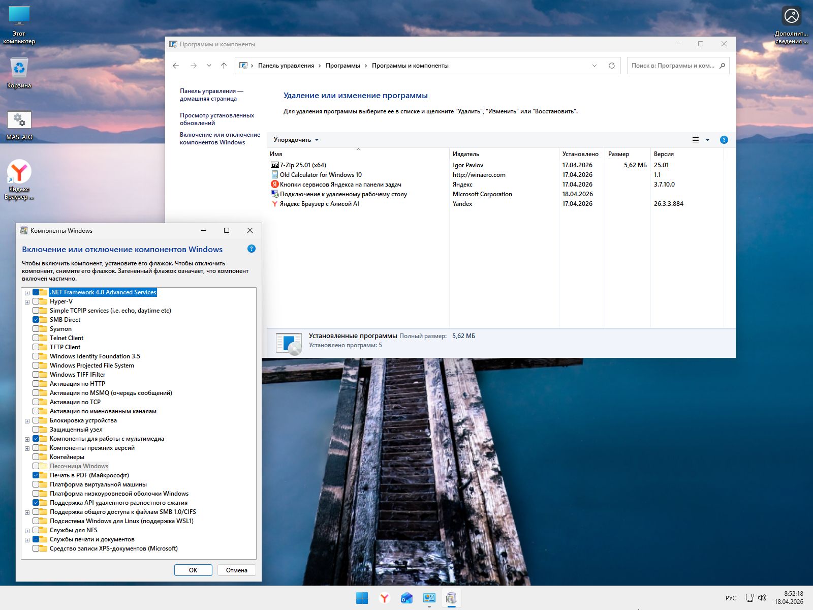 Windows 11 26H1 — самая свежая на сегодняшний день версия операционной системы от Microsoft, и именно на ней OneSmiLe выпустил свой очередной облегчённый образ (build 28000.1836). Для тех, кто следит за релизами этого автора, формула знакомая: оригинальный дистрибутив от Microsoft берётся за основу, оптимизируется через DISM, из него удаляются модерн-приложения и компоненты слежки, после чего install.wim сжимается в ESD для компактности. Но в случае с 26H1 есть важный нюанс — это первый крупный релиз новой Windows 11, и его база заметно отличается от 24H2 и 25H2. Новый билд сборки 28000.1836 говорит о существенных внутренних изменениях по сравнению с предыдущими версиями. Источником послужил официальный образ ru-ru_windows_11_business_editions_version_26h1_updated_march_2026_x64_dvd с накопительными обновлениями, интегрированными по 15 Апреля 2026 года. В ISO доступны несколько редакций — подходящая выбирается непосредственно при установке, отдельный образ под каждую скачивать не нужно. Скачать сборку Windows 11 26H1 64 бит для ноутбука на русском можно через торрент или прямой ссылкой в формате ISO — размер файла уменьшен за счёт ESD-упаковки, и образ без проблем помещается на флешку стандартного объёма в 4 Гб. Активация встроена в процесс развёртывания и срабатывает автоматически. Реализованы два метода: HWID — бессрочная цифровая привязка лицензии к конфигурации оборудования, и KMS38 — корпоративная лицензия, действующая до 2038 года. Для HWID-активации потребуется интернет в момент установки. Проверки TPM 2.0 и Secure Boot отключены на этапе подготовки дистрибутива, так что образ разворачивается и на тех машинах, которые Microsoft считает формально несовместимыми с Windows 11. Как и в других сборках автора, из системы удалены все модерн-приложения, при этом поиск продолжает работать — иконка просто скрыта с панели задач. Предустановлены Яндекс Браузер и архиватор 7-Zip, оба попадают в систему автоматически при развёртывании. Сразу после появления рабочего стола можно открывать сайты, скачивать нужный софт и распаковывать загруженные файлы, не тратя время на поиск и установку базовых инструментов. Момент, который стоит учесть до установки: среда восстановления Windows (WinRE.wim) удалена из образа, создание точек восстановления отключено. Это часть общей концепции облегчения дистрибутива — на диске высвобождается дополнительное место, но при серьёзном сбое восстановить систему штатными средствами не получится. Загрузочную флешку с дистрибутивом после установки лучше сохранить.