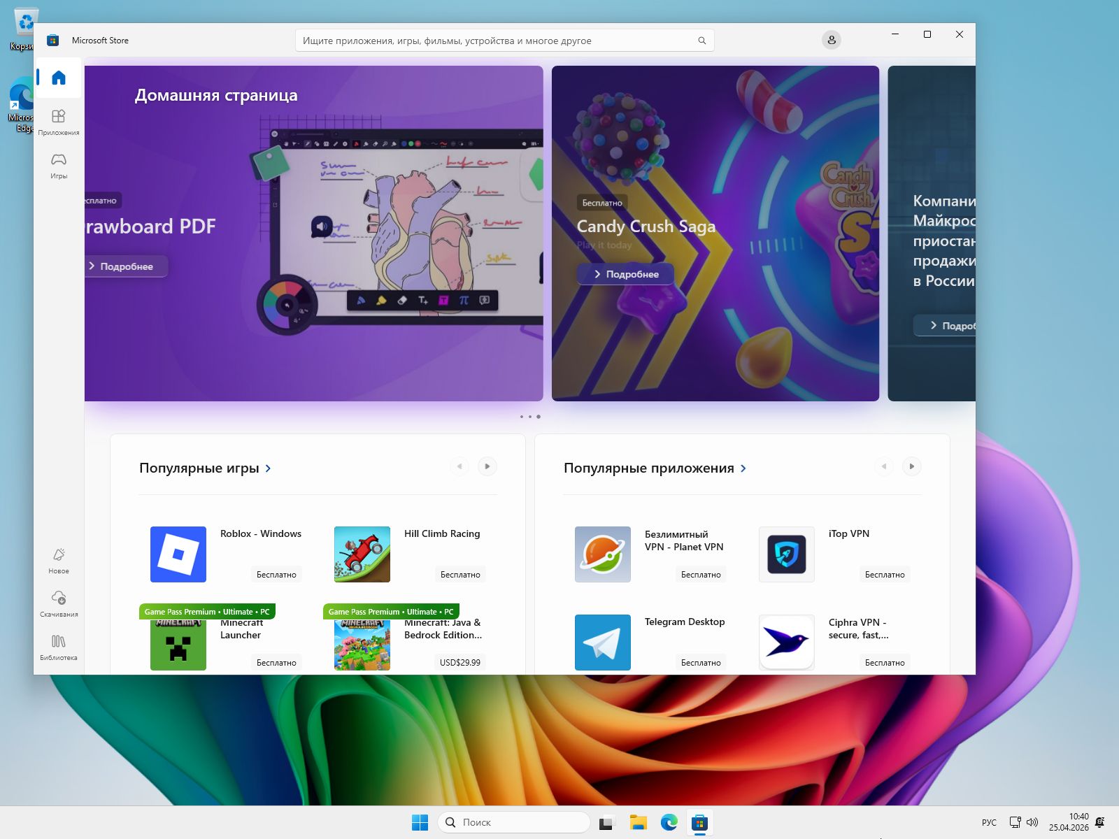 | Магазин (Microsoft Store) | Сохранён — нужные приложения можно установить через него |