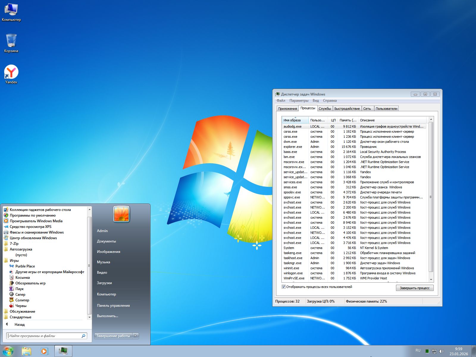 • Яндекс браузер. Основным обозревателем по умолчанию в Семерке является Internet Explorer. Он уже давно не позволяет открывать большинство сайтов. Даже Microsoft прекратили его обслуживание. Yandex Браузер – один из самых популярных обозревателей в рунете, с прилагающимися нейросетями, а также голосовой помощницей Алисой. Он установится автоматически вместе с ОС. Браузер быстрый, удобный и постоянно обновляется, так что проблем с посещением сайтов не будет.